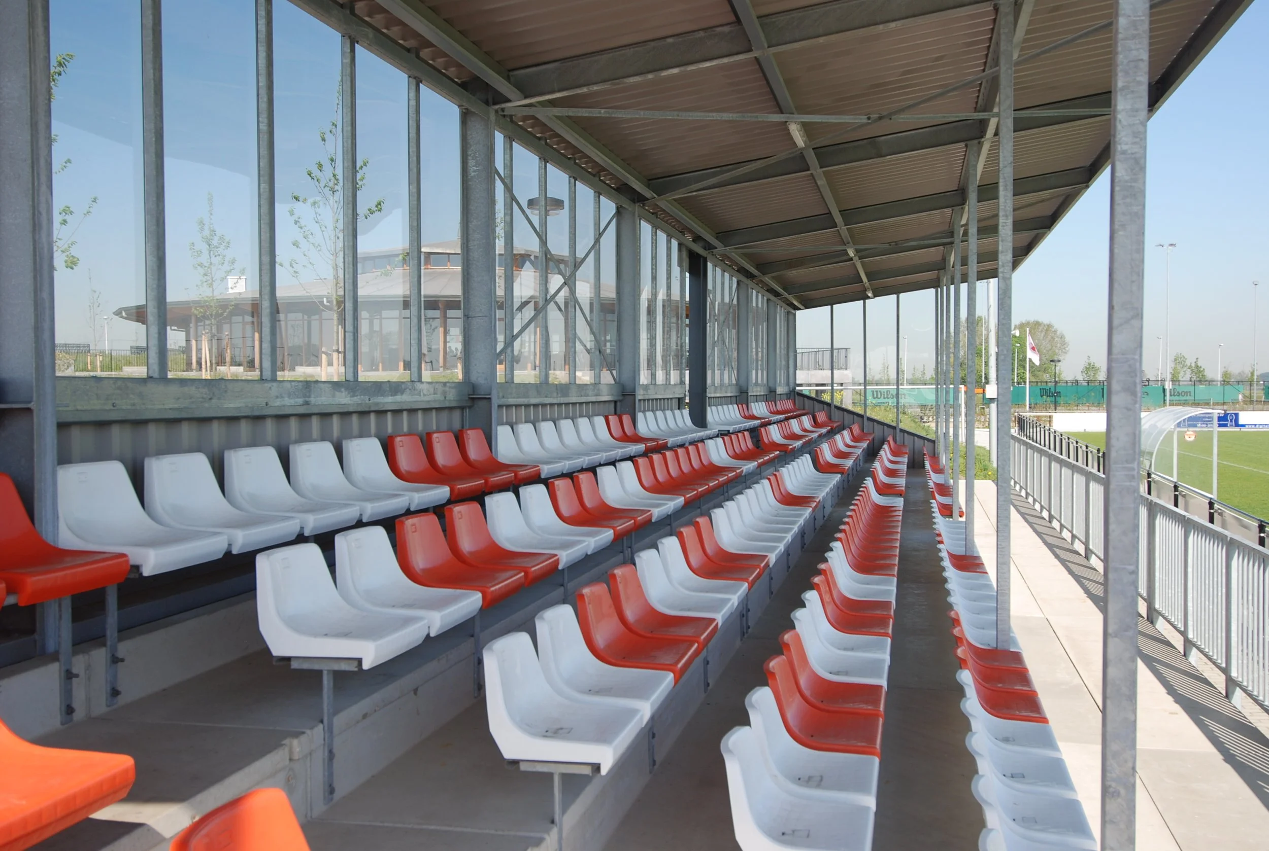 In de solide onderbouw bevinden zich kleed- en wasruimten rondom een multifunctionele theaterruimte. Daarboven verheft zich een transparant volume opgebouwd uit een lichte houtconstructie met gelamineerde liggers en houten kolommen. Hier zijn de kantine, bar, keuken, vergaderruimten en ondersteunende functies ondergebracht. Deze hybride constructie versterkt het contrast en draagt bij aan duurzaam en circulair bouwen.